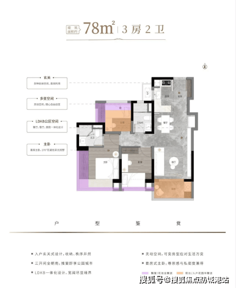 建面约78㎡的三房两厅两卫户型,验证!